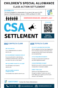 If you were a child in care with any child and family services (CFS) agency in Manitoba between Jan. 1, 2005 and March 31, 2019, you may be included in an agreement signed by the Province to settle class action lawsuits related to the children’s special allowance (click here to read the press release from March 2024). On Sept. 5, 2024 , Justice Huberdeau approved the Settlement Agreement.