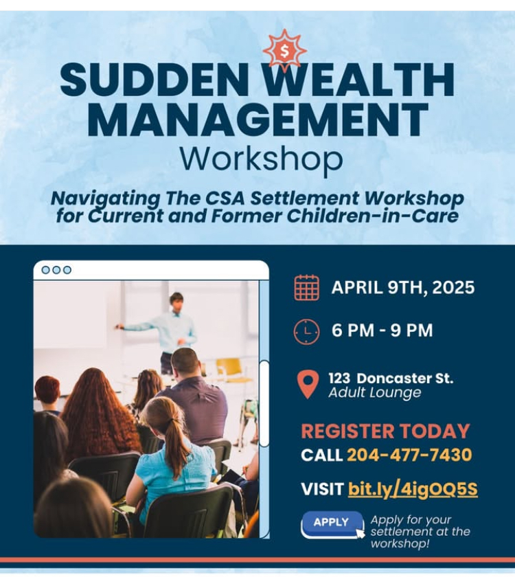 The Sudden Wealth Management Event at JCFS, which will run from 6 to 9 p.m., will feature representatives from SEED Winnipeg (Supporting Employment & Economic Development) and the Exchange Group (the claims administrator). They will be on hand to answer questions and to assist youth to fill out their claim forms. Dinner will be included. Please note that registration is required for this event. See poster below for more details.
