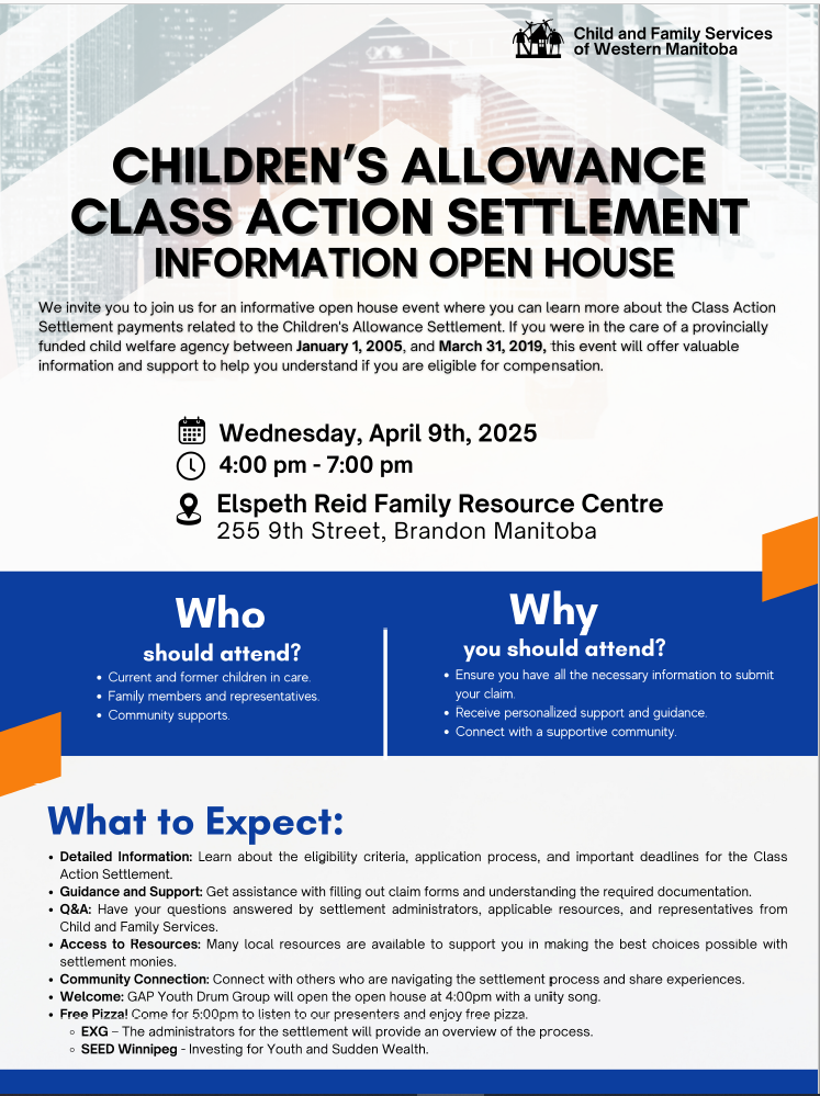The CSA Settlement Open House event at CFS of Western Manitoba will also be held on April 9, from 4 to 7 p.m. The Exchange Group, SEED Winnipeg and CFS of Western will be in attendance to answer questions, provide detailed information about the claims process, and help youth and families fill out forms. SEED will provide information about handling sudden wealth.